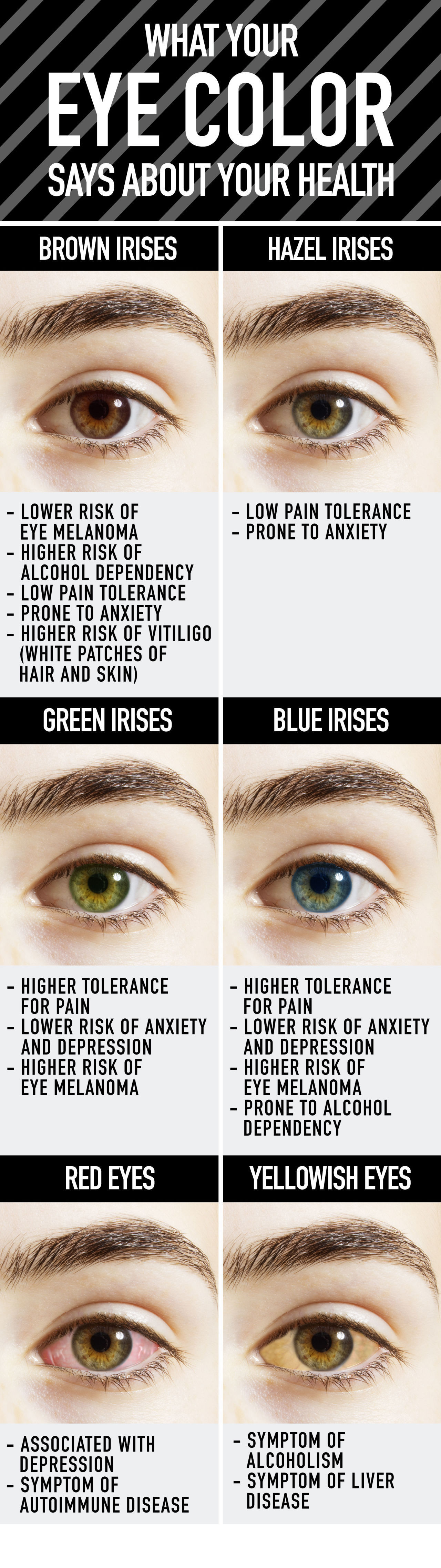 Of course your actual risk of developing a particular disease depends on countless other factors, like your environment and genes. Also obvious: You'd need to be an eye doctor to detect the most serious warning signs. But if you want to know what your eye color, alone, could say about your health risks, consult this chart. (Just be sure to rely on your doctor for a 360-degree assessment.)